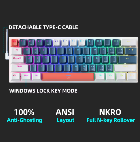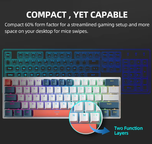 K500-B61 미니 기계식 키보드는 컴팩트한 60% 폼 팩터로 공간 활용이 뛰어나고, 풀 사이즈 키보드의 주요 기능을 그대로 담아냈습니다. 이 키보드는 책상 위의 공간을 넓혀주어 마우스 스와이프와 같은 동작에 더욱 자유로움을 제공합니다.