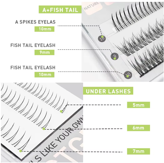 이 제품은 다양한 길이와 볼륨을 조절할 수 있도록 구성되어 있어, 자연스러운 속눈썹 연출이 가능합니다. 짧은 속눈썹은 자연스러운 데일리 메이크업에, 긴 속눈썹은 화려한 룩을 완성하는 데 적합합니다. M 모양과 A 모양의 두 가지 스타일로 개성 있는 스타일링이 가능해 다양한 메이크업 룩에 활용할 수 있습니다.